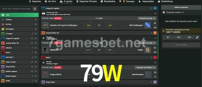 O 79W oferece uma grande seleção de opções de apostas em e-sports com probabilidades competitivas
